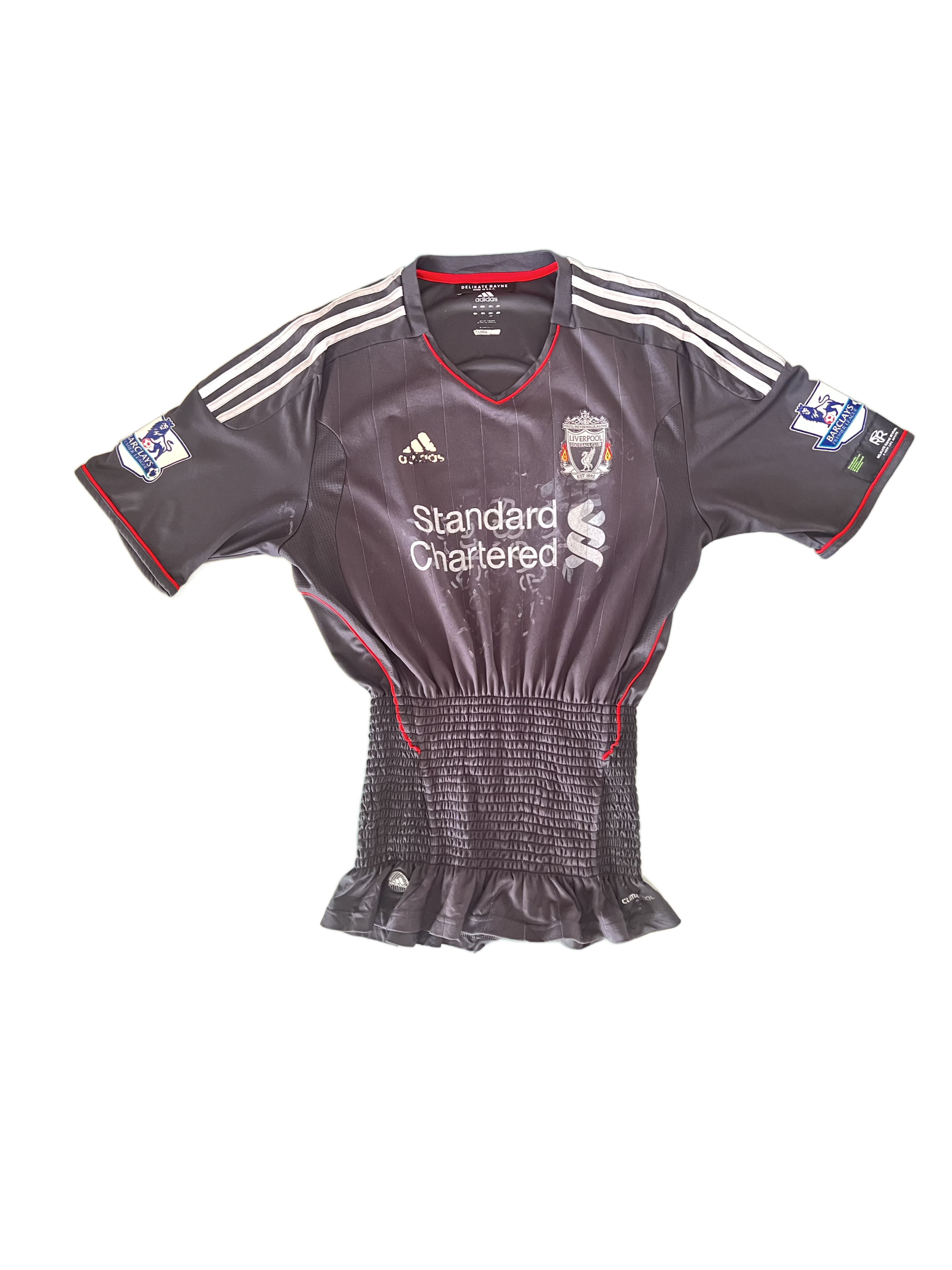 Elevate your collection with this reimagined and distressed Liverpool Suarez 2011 soccer jersey. Rescued from vintage discards destined for the landfill, each piece has been transformed into a one-of-one collector’s item. The signature DRR patch on the sleeve and shirred waist detailing create a flattering, tucked-in silhouette, while the cropped length ensures a standout look. Fits XS/S best.