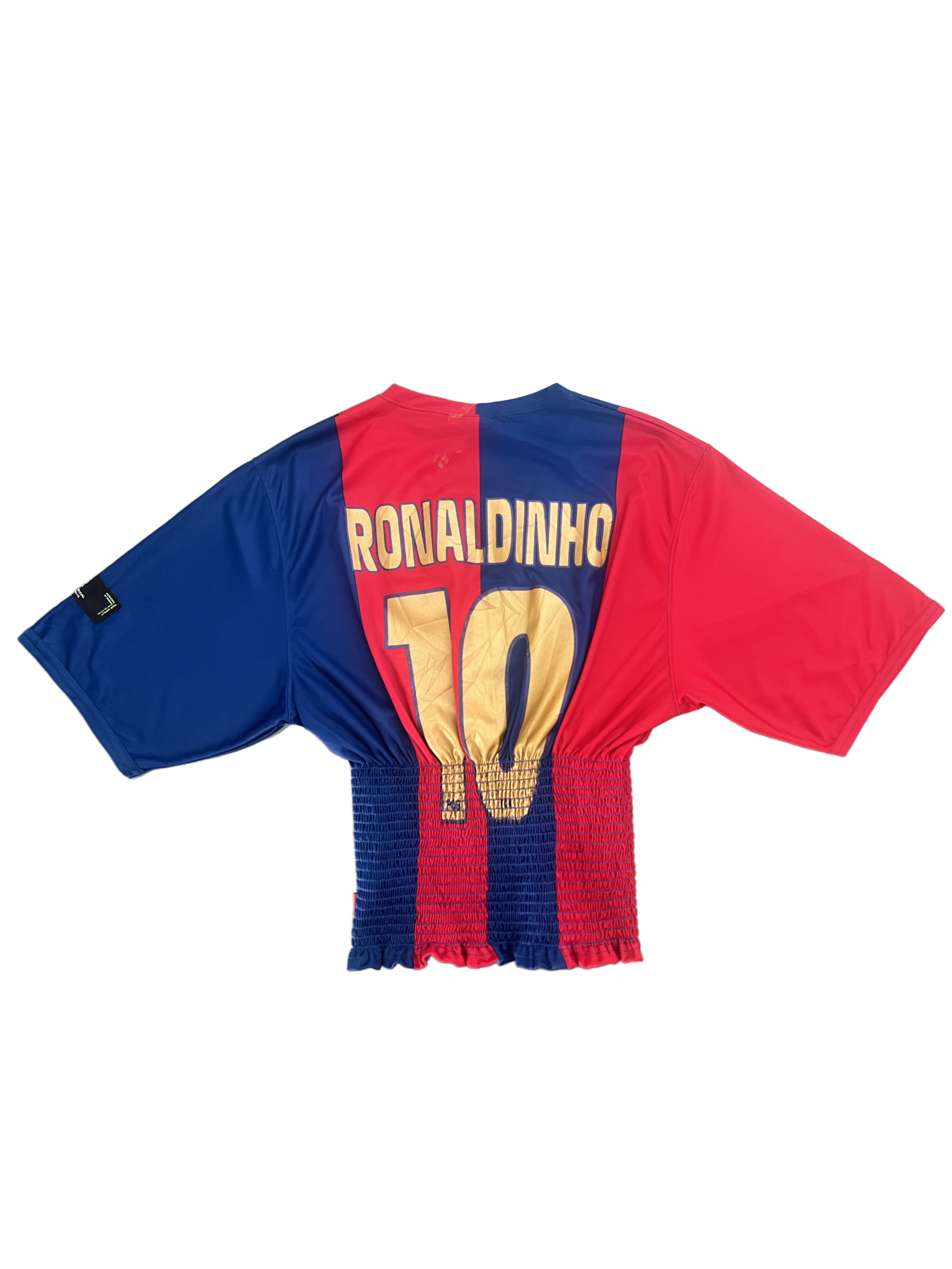 Elevate your collection with this hand-cropped, reimagined Barcelona Ronaldhino soccer jersey. Rescued from vintage discards destined for the landfill, each piece has been transformed into a one-of-one collector’s item. The signature DRR patch on the sleeve and shirred waist detailing create a flattering, tucked-in silhouette, while the cropped length ensures a standout look. Fits XS/S best.