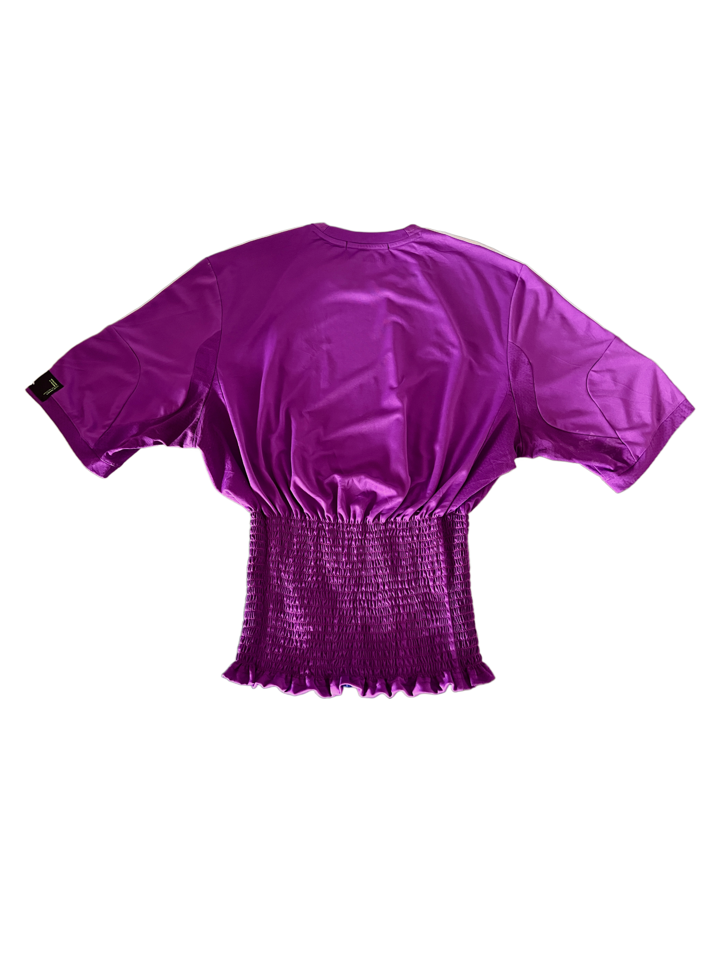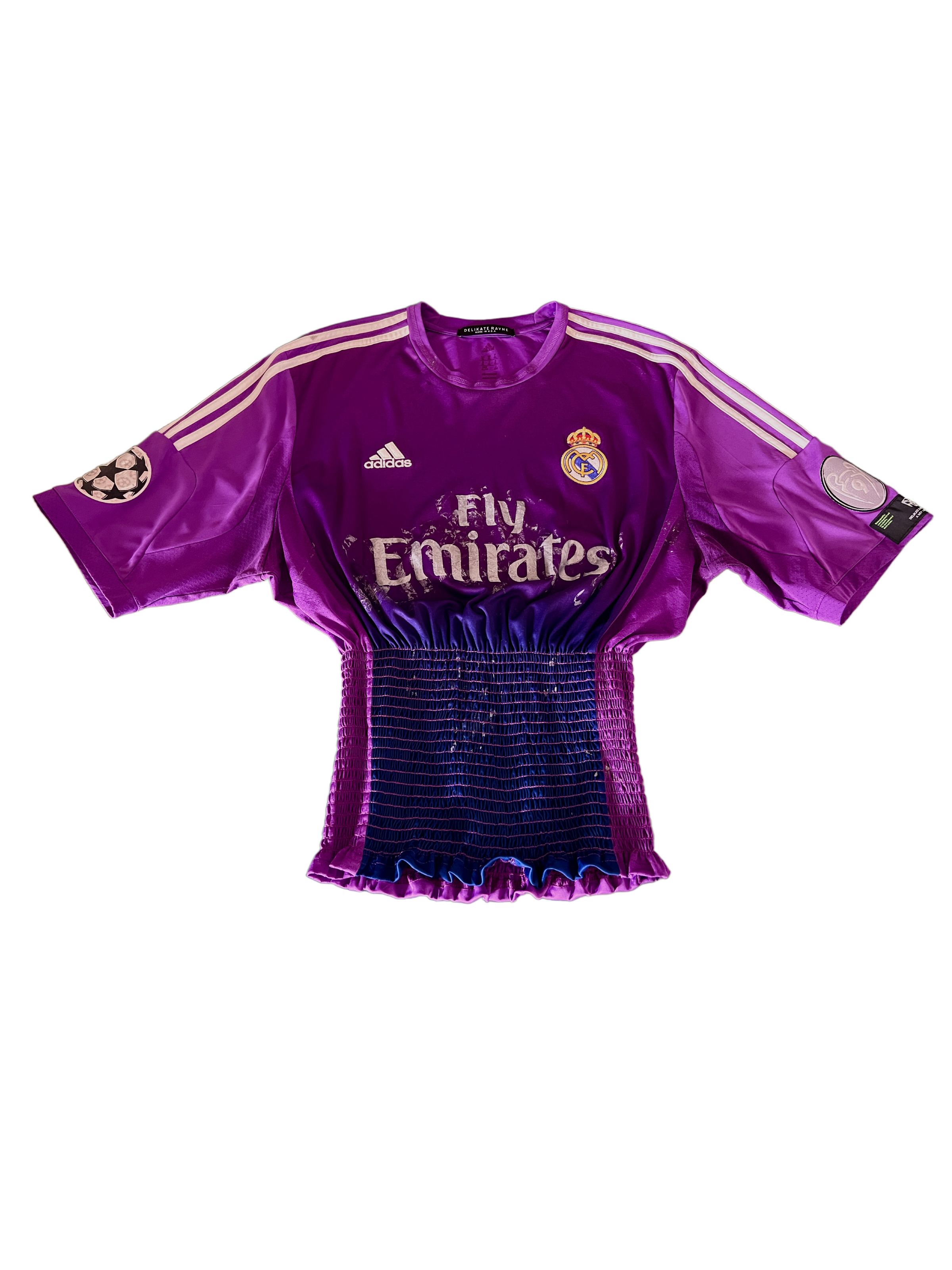 Elevate your collection with this hand-cropped, reimagined Real Madrid purple soccer jersey. Rescued from vintage discards destined for the landfill, each piece has been transformed into a one-of-one collector’s item. The signature DRR patch on the sleeve and shirred waist detailing create a flattering, tucked-in silhouette, while the cropped length ensures a standout look. Fits XS/S best.