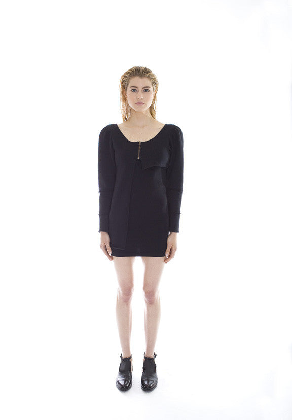 Super Soft asymmetrical cotton fleece jacket. Featuring exposed seams sewing details and exposed gold zipper. One side of the jacket is longer (hits approximately above the thigh) and the other side is cropped (hitting approximately right below the breast). Item runs true to size with a slight loose fit.