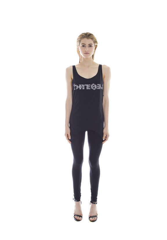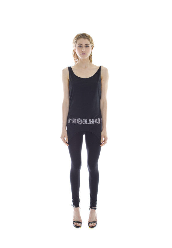Delikate Rayne signature 4-in-1-tank, can be worn in 4 different ways. Item has low armholes and scoop neckline. Featuring an ambigram that reads "conquer" when worn one way and "destroy" when worn another. Tank can also be worn cropped to display graphic or flipped to wear as a solid crop top. Designed to fit as a relaxed silhouette and is slightly over sized.