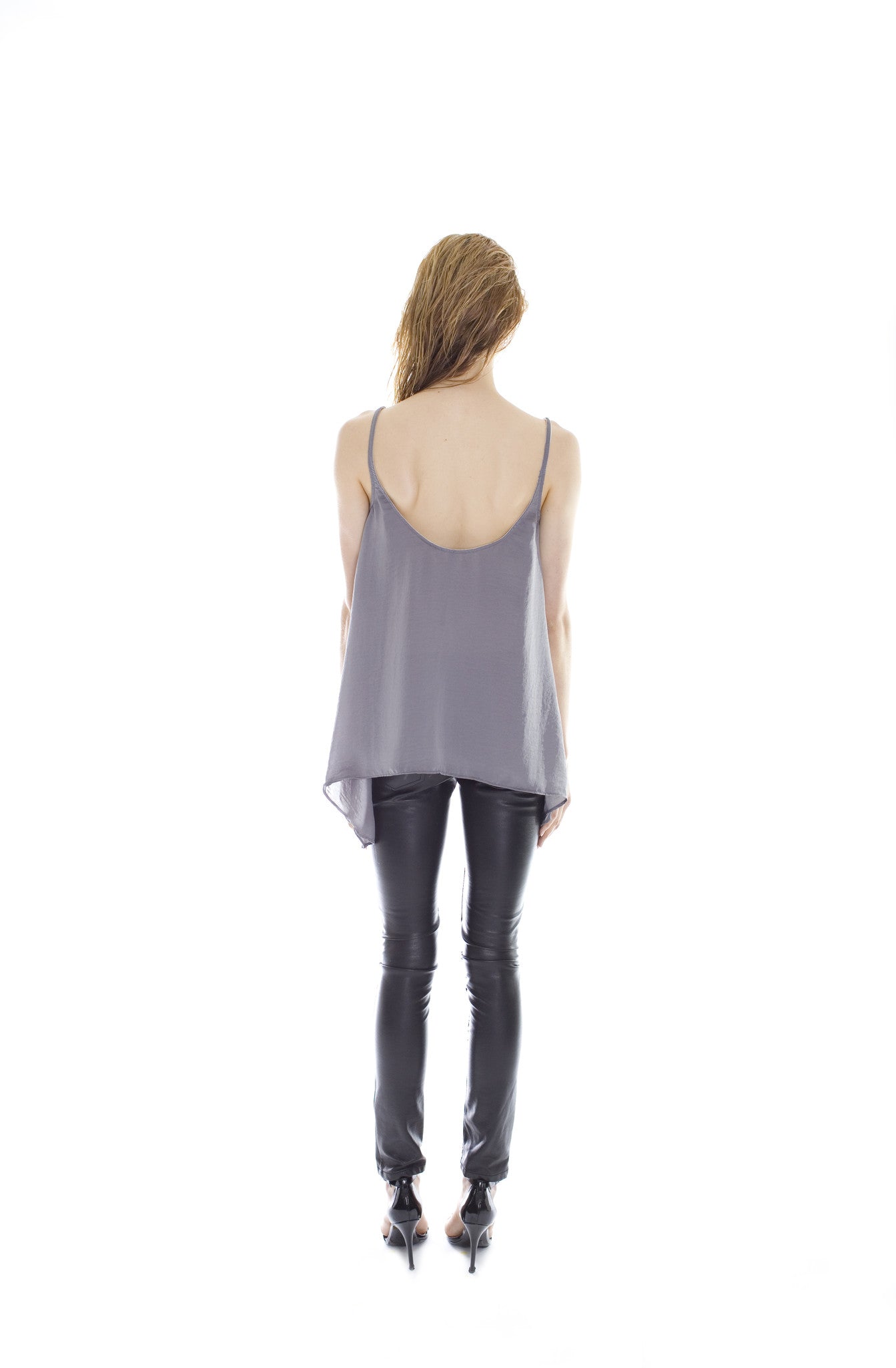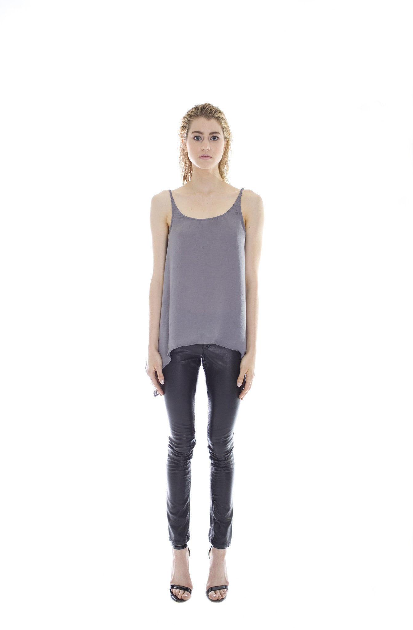 Side drape tank constructed in silky, smooth, fluid satin. Featuring a scooped u/v neckline with longer side pieces, french seams and a low back drop. Item runs true to size and has a relaxed silhouette. Wear to bed or out on the town, transitions easily from day to night.