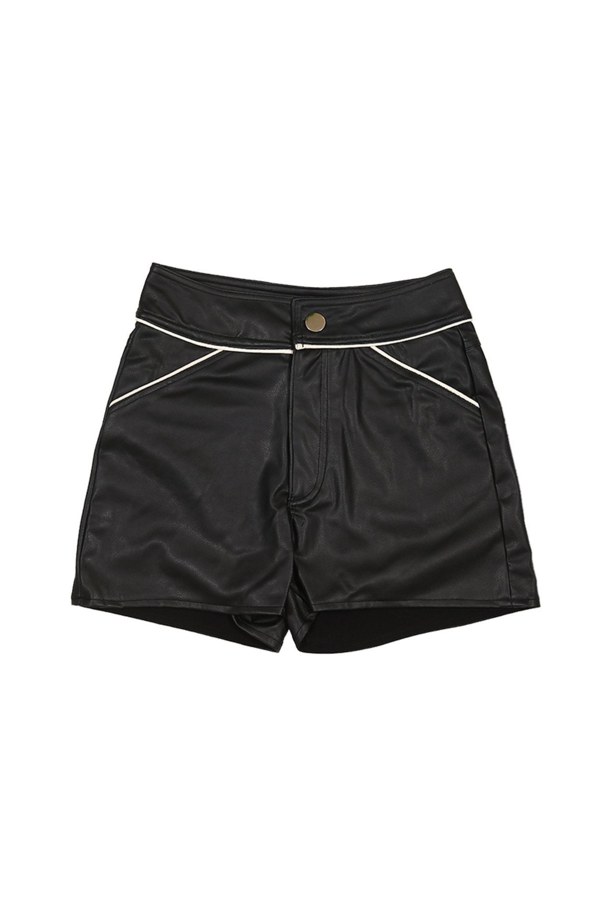 Super soft and luxurious Vegan stretch leather high-waisted shorts with piping detail, fully lined. This item runs mostly true to size. If you want a form fitting look choose your normal size and size up for a more casual fit.