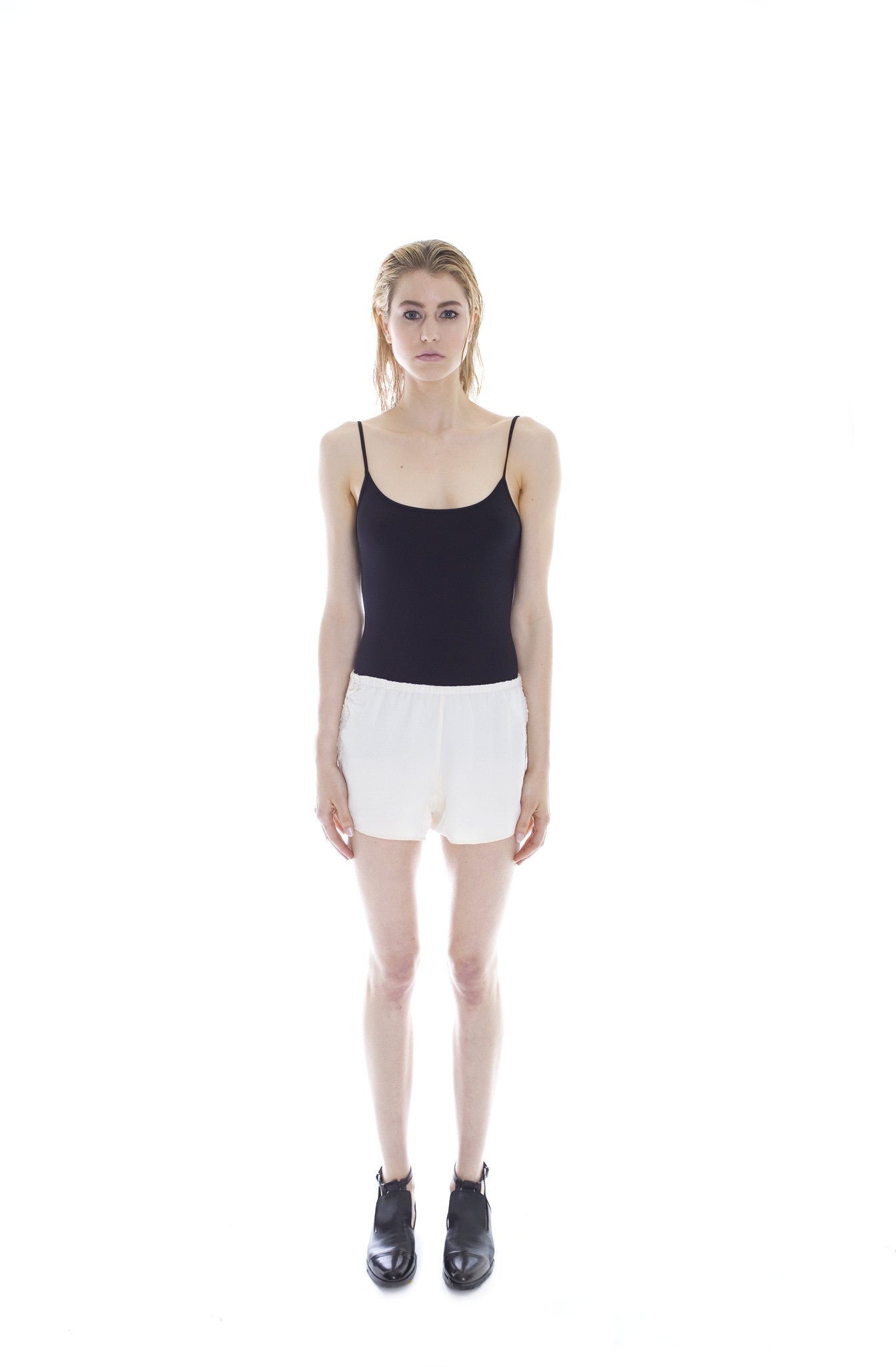 Pull on silky, satin, liquid smoothness to the touch lingerie inspired short. Featuring an elastic band to allow for free range of movement and black venice lace detail down both the left and right sides. The perfect piece to transition easily from day to night dressed up or down. Pair with the matching venice lace trim kimono. Fits slightly oversized and can be worn high waisted, down low or at the natural waist line.