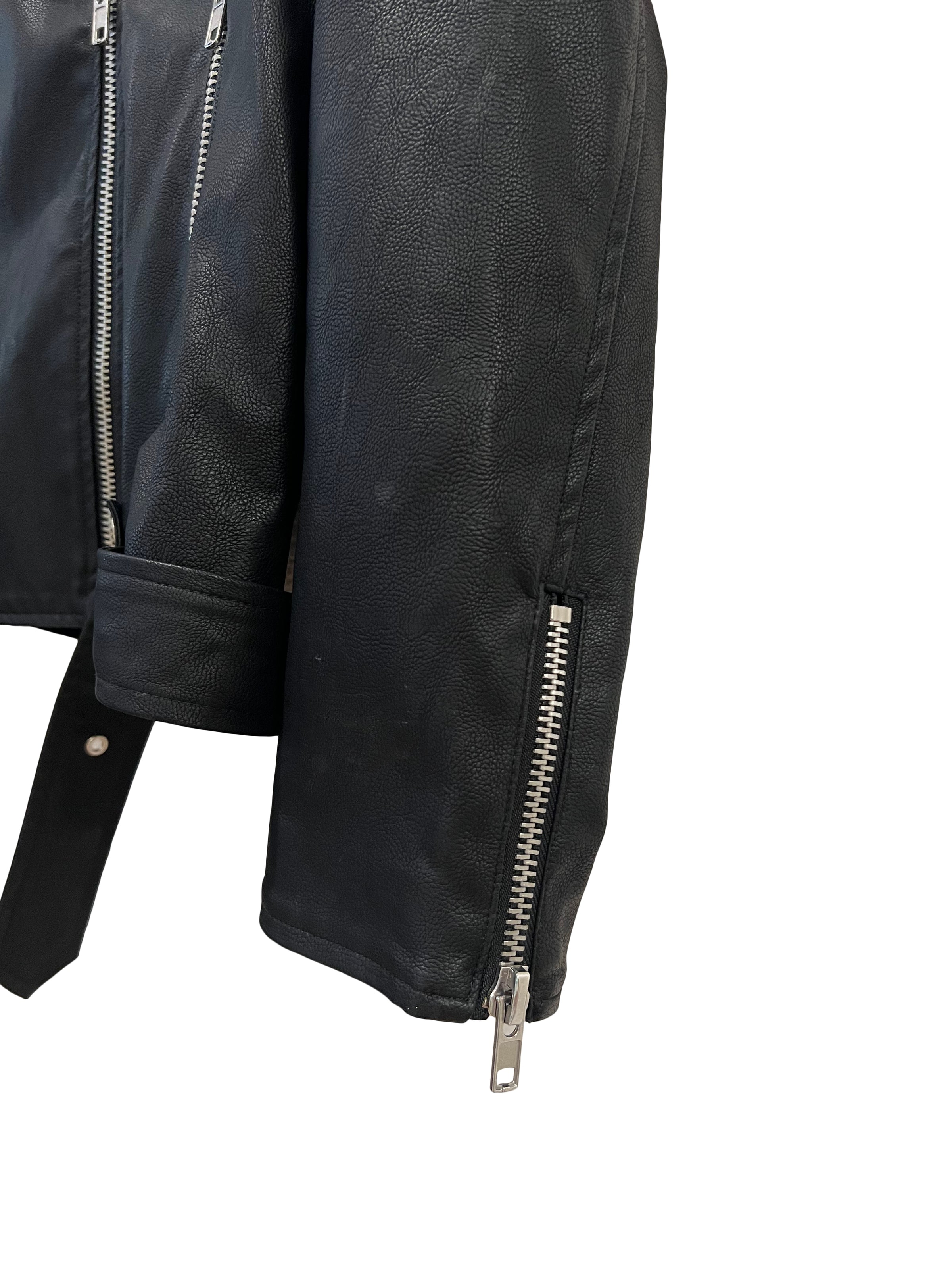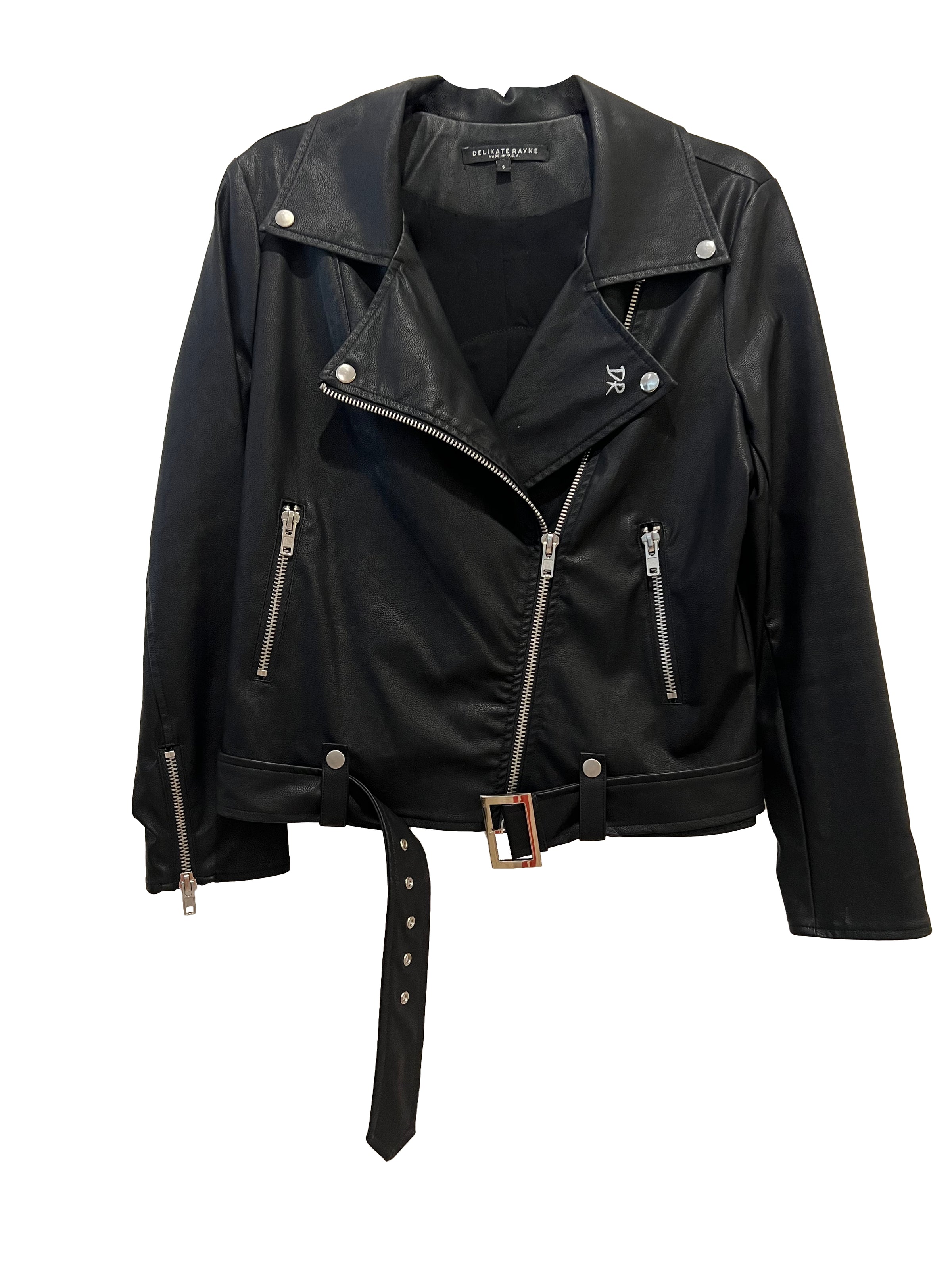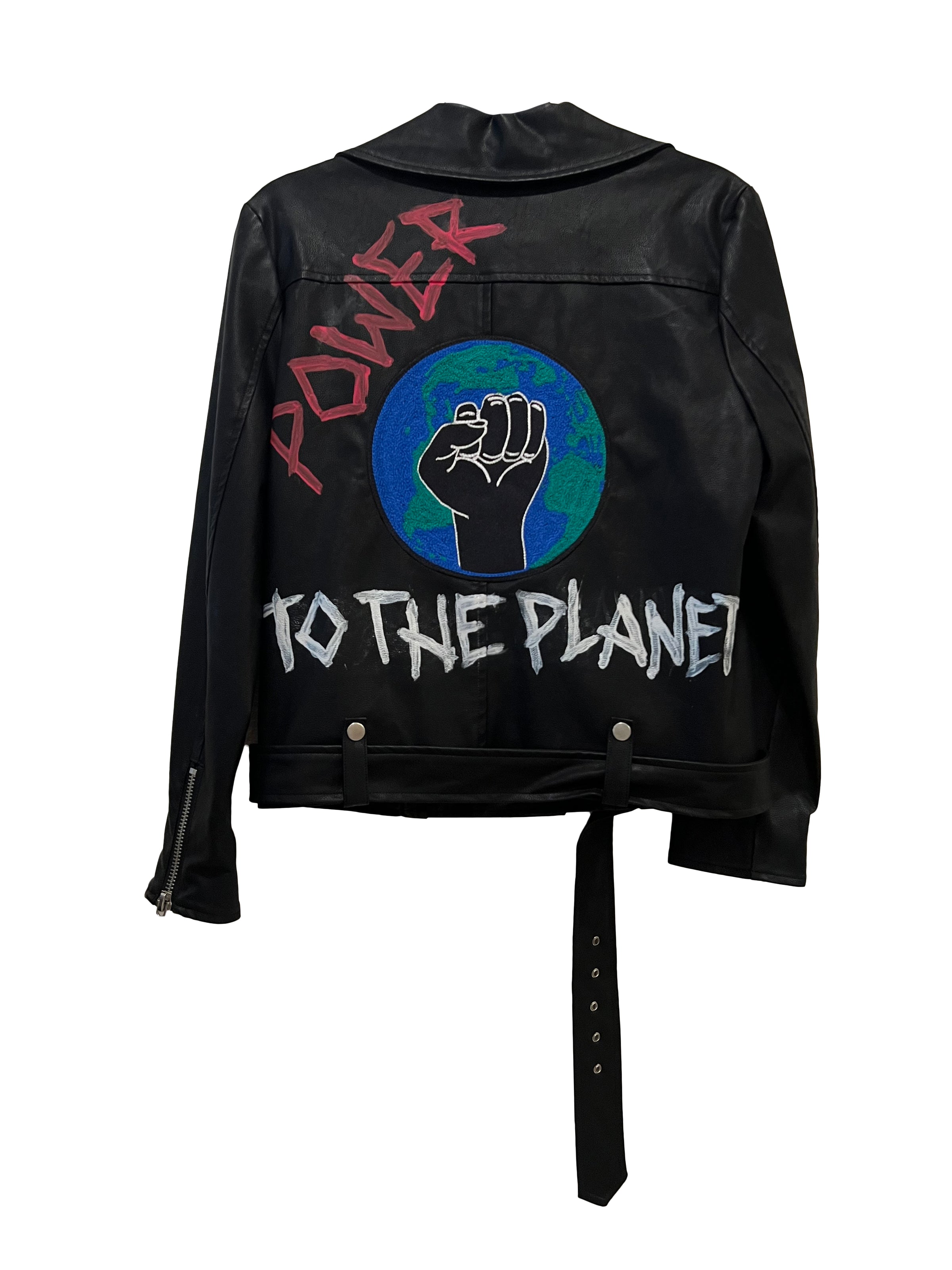 A cruelty-free take on the classic moto jacket. An ultra stylish, rare, custom made jacket that is an exclusive one-of-one garment. No other like it exists! Constructed out of our best selling eco, vegan leather this jacket infuses cool like no other. Featuring a exposed oversized silver hardware, front zipper closure, handwritten DR in silver paint on front lapel, zipper detailing on sleeves and front of jacket, belt detail at waist, hand embroidered speciality chain stitching globe (green and blue) with fist (black and white) design and "POWER TO THE PLANET" handwritten in neon pink and white paint