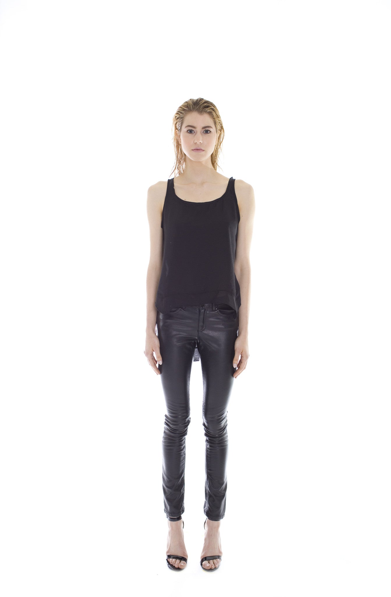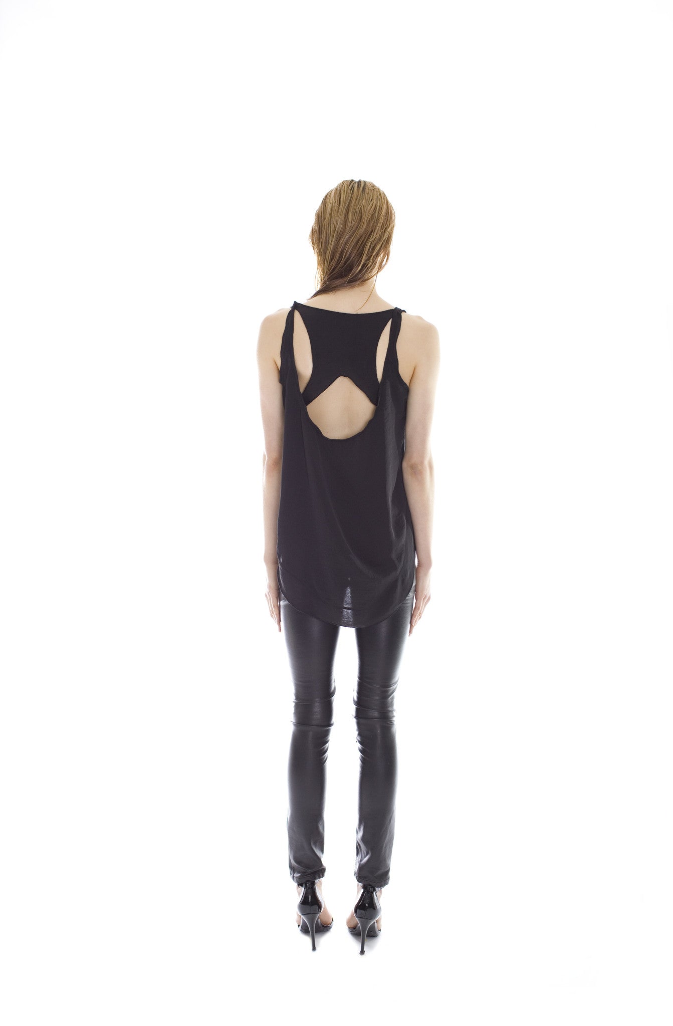 An updated take on the classic racer back style tank. Constructed in silky, smooth, fluid satin with clean lines. Luxuriously soft to the touch. Featuring cut out detail on back piece, french seams and a high-low hem. Item has a slightly oversized, slouchy fit. Looks great paired with the vegan satin trim shorts or vegan leather mini skirts.