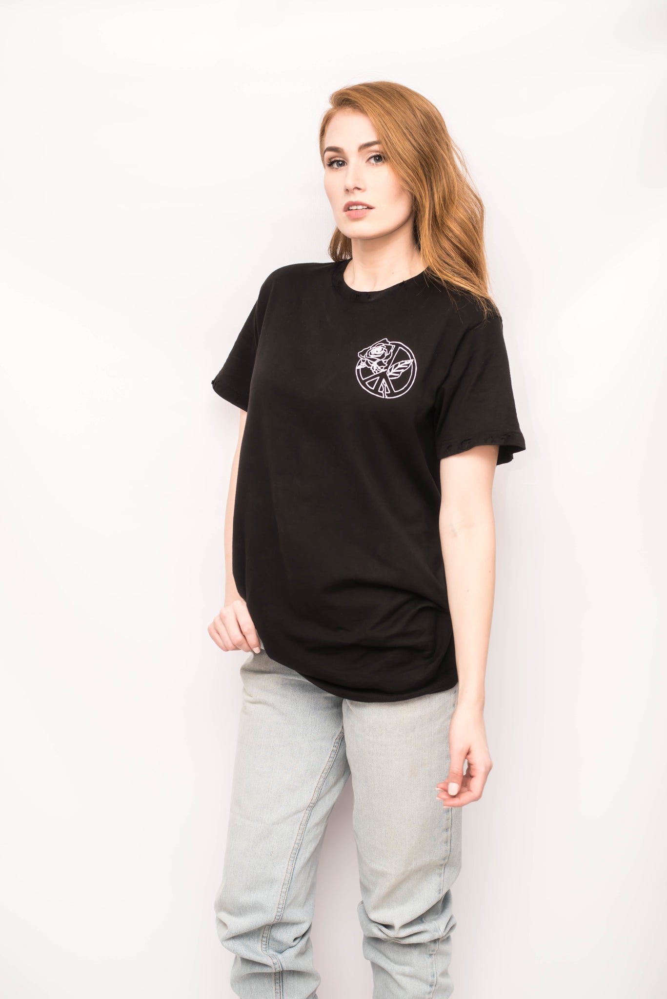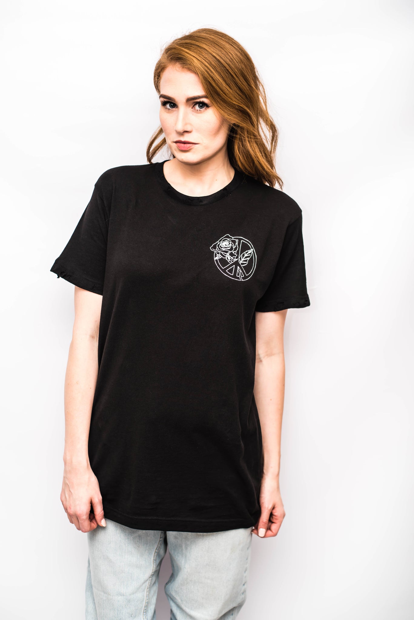 This is a unisex item has a crew neck neckline. With a relaxed, slightly over-sized, more of a male's fit. Features hand distressing (so no two shirts are ever the same) at the front + back collar and at the edge of sleeves on both sides. There is also a silk screened graphic in white on the front and back that reads "Peace Begins With Compassion"