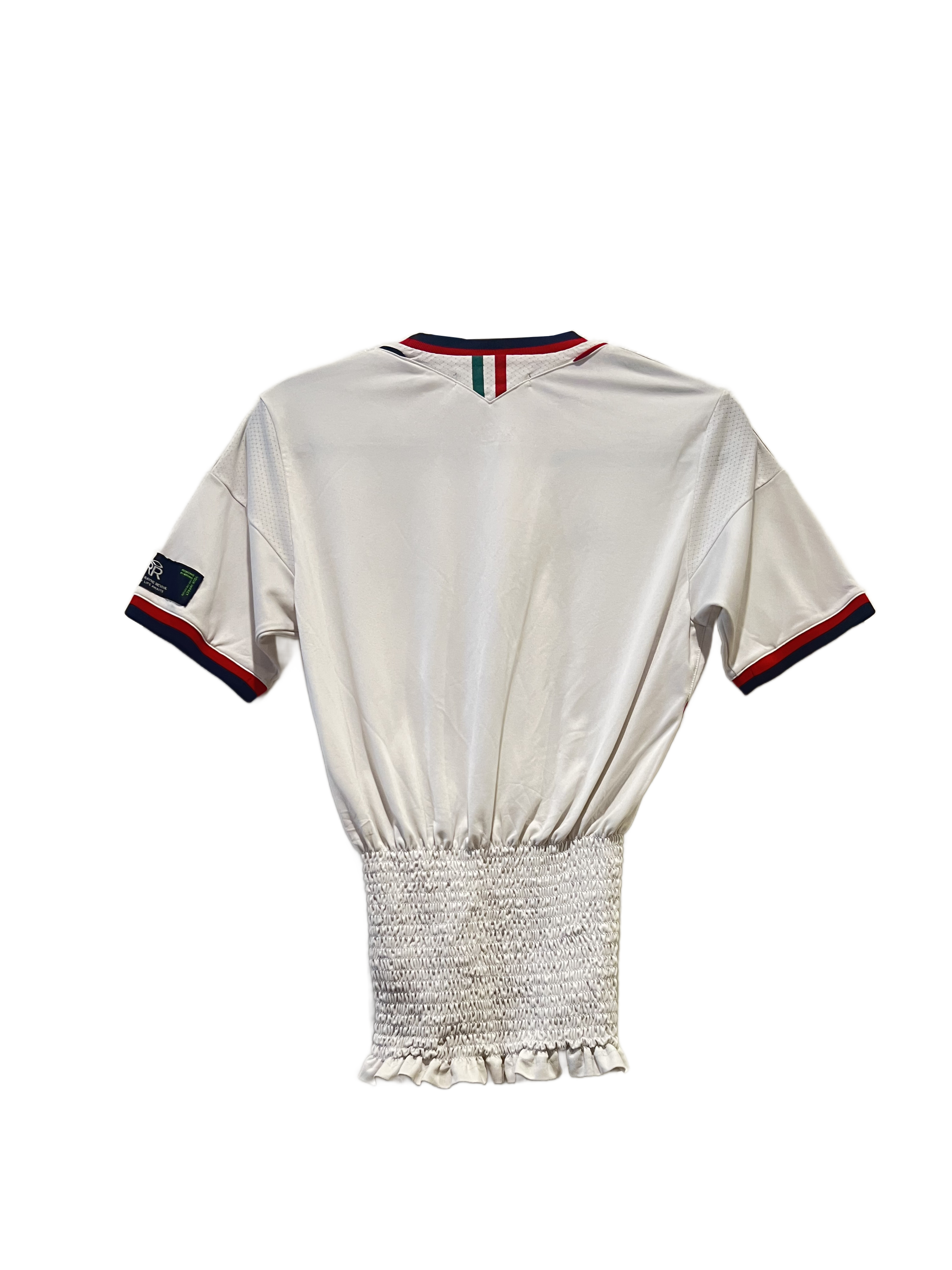 Elevate your collection with this reimagined Milan soccer jersey. Rescued from vintage discards destined for the landfill, each piece has been transformed into a one-of-one collector’s item. The signature DRR patch on the sleeve and shirred waist detailing create a flattering, tucked-in silhouette, while the cropped length ensures a standout look. Fits XS/S best.