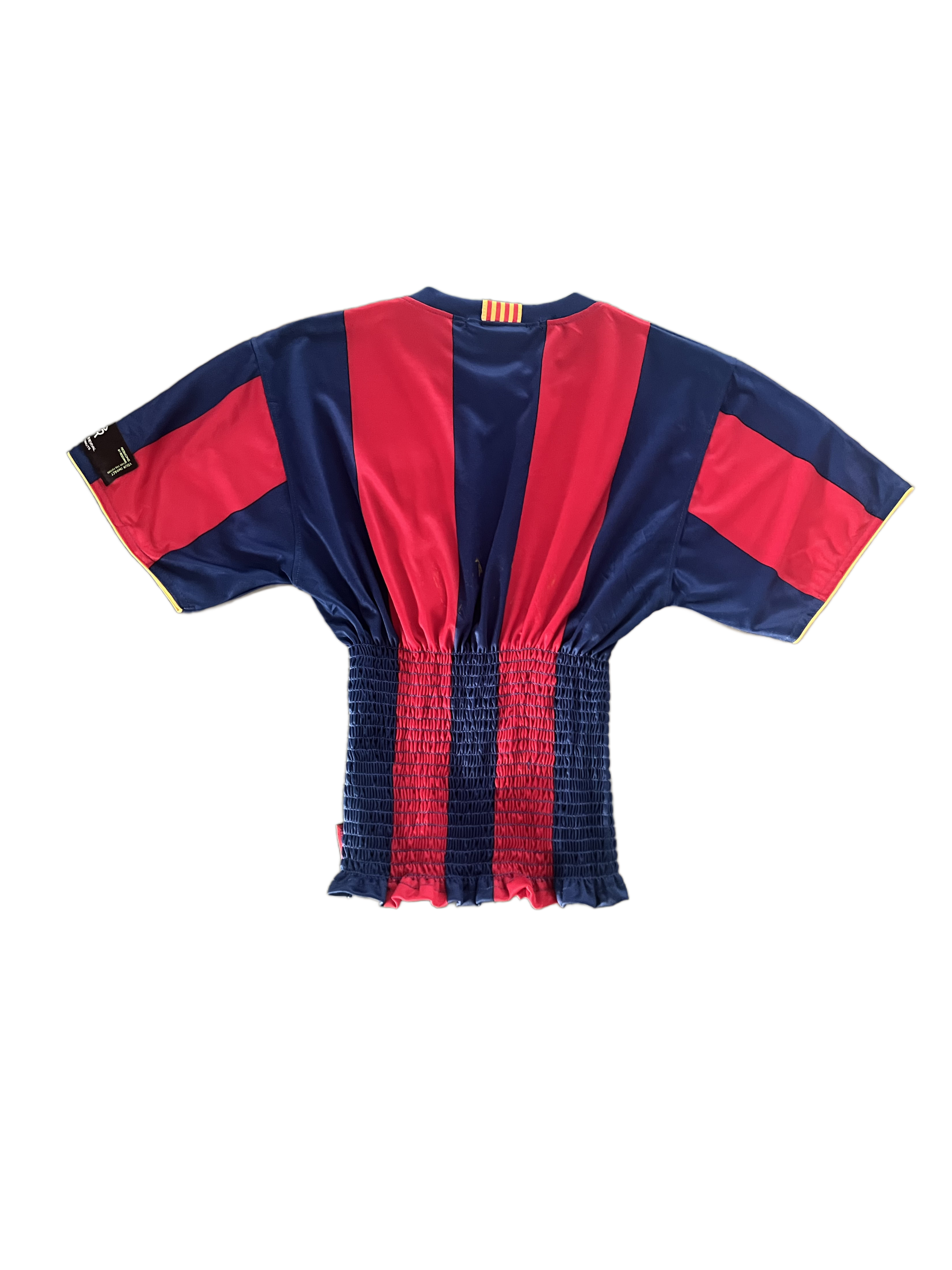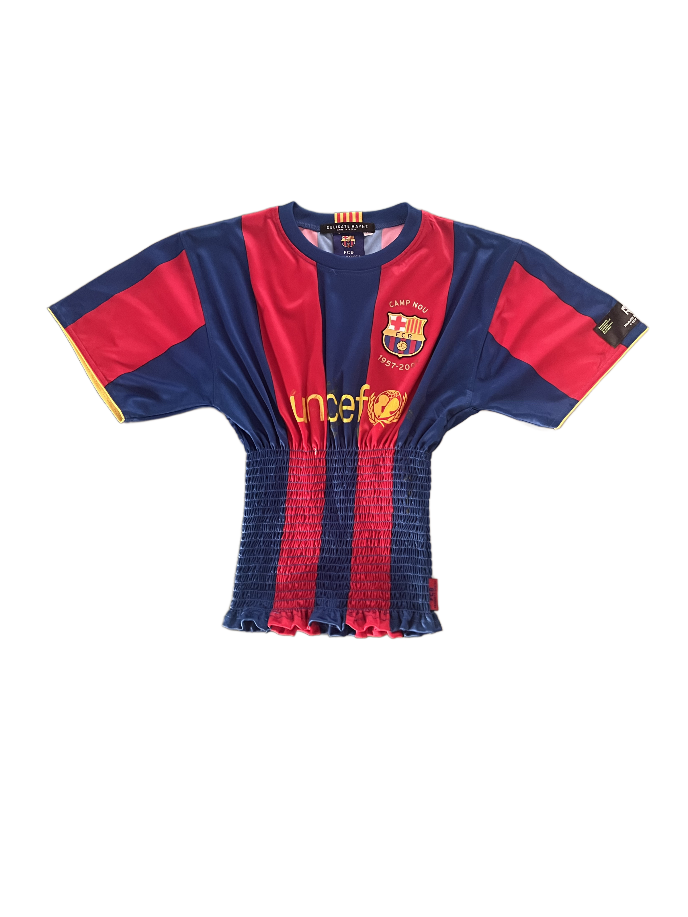 Elevate your collection with this hand-cropped, reimagined Barcelona soccer jersey. Rescued from vintage discards destined for the landfill, each piece has been transformed into a one-of-one collector’s item. The signature DRR patch on the sleeve and shirred waist detailing create a flattering, tucked-in silhouette, while the cropped length ensures a standout look. Fits XS/S best.