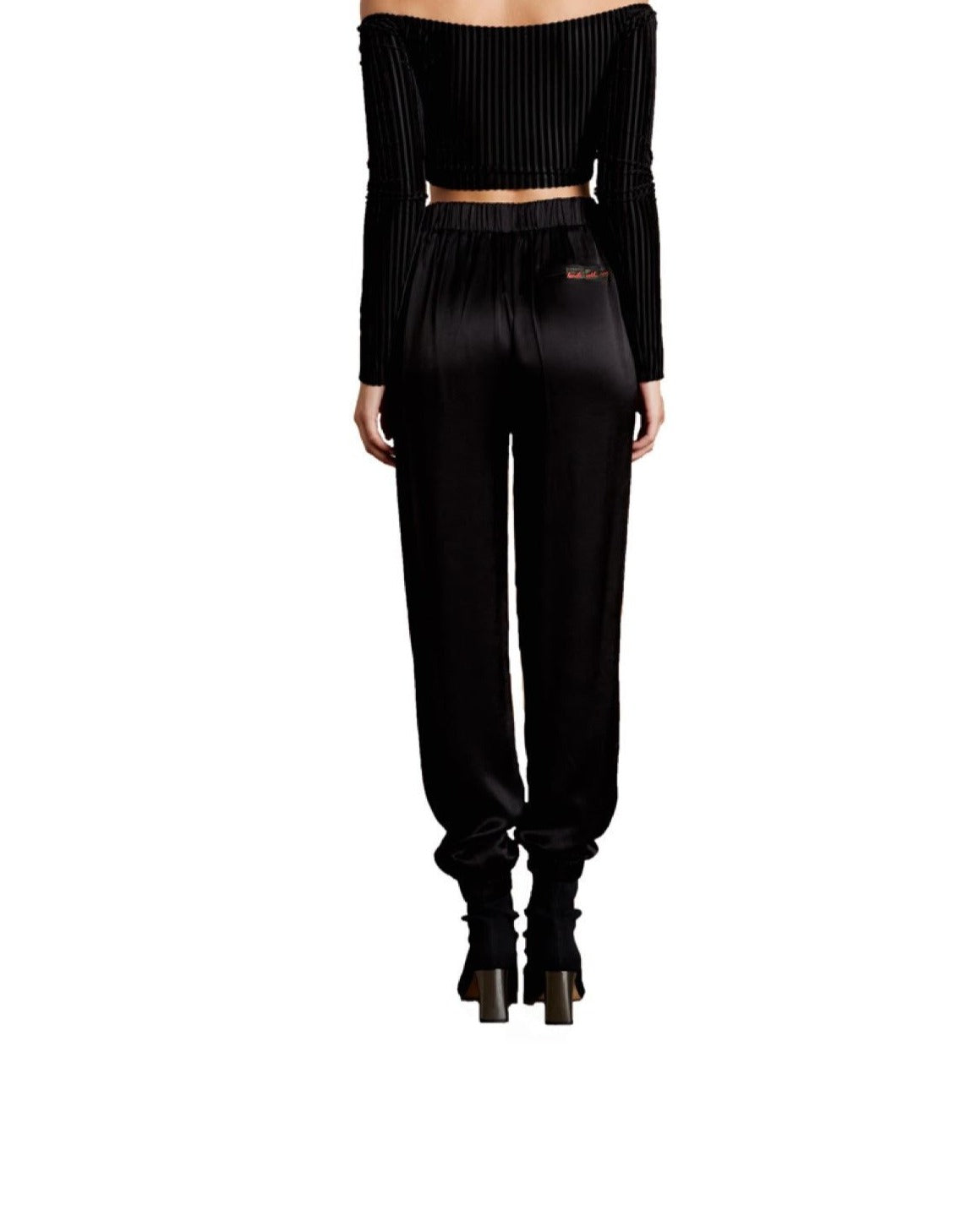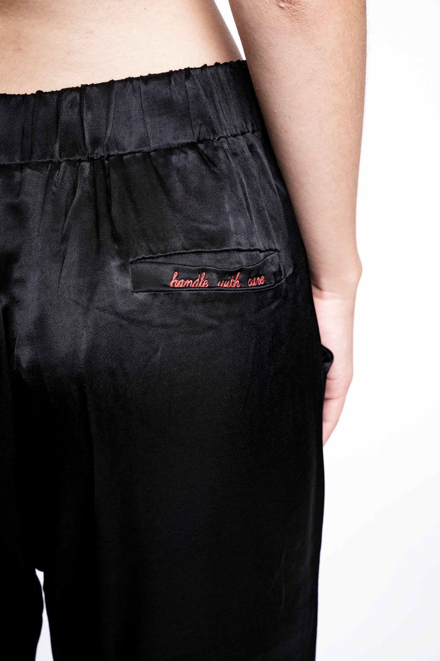 The perfect transition pants to create multiple outfits around. Pair with a sweatshirt for a cool street style or with a blazer for a more chic look. Constructed out of silky, smooth, fluid satin. Feels extra smooth and soft against your skin. Featuring a pull on, no button or zipper waist. Elastic cuffs at the bottom, side slit pockets and embroidered "handle with care" on the backside pocket flap. Item runs true to size with a relaxed fit, not meant to be super tight.
