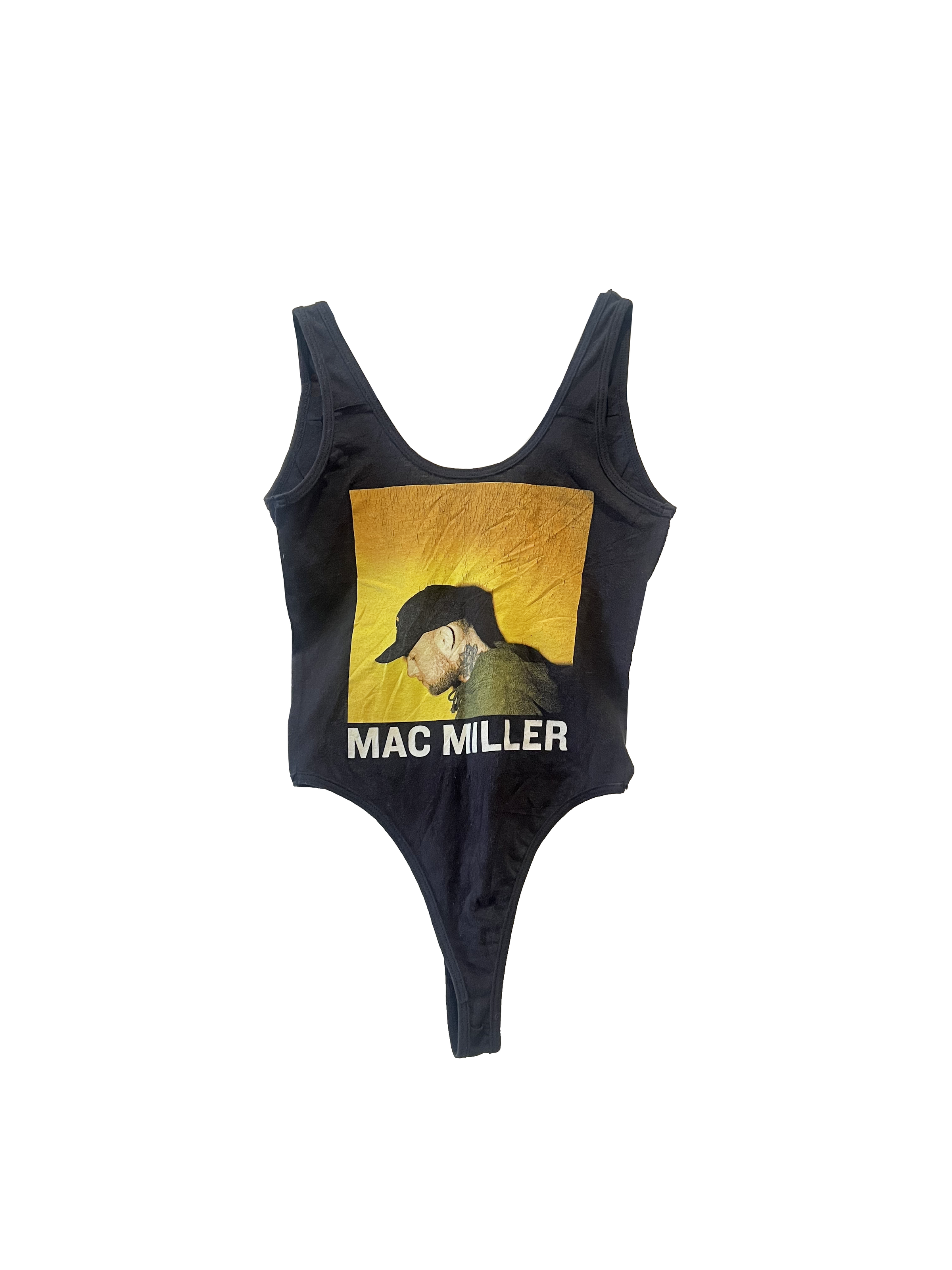 Bringing a sexy, cool update to your fav vintage tee. Icons in bodysuit form, perfect for a festival, concert, summer night out or layered up to elevate your fall and winter looks. This bodysuit constructed out of a discarded, secondhand Mac Miller tee features our signature DRR patch on the back, exposed seam sewing details, low cut back and thong form to contour your figure while still maintaining comfort. The result? A smooth look under your jeans, skirt or shorts. This t-shirt has been rescued from being thrown away- hand picked and carefully sourced to bring you an exclusive one of one item. Due to the nature of this reworked item, there is limited to no stretch in the fabric. Size indicated is approximate and would fit most in that size range best. If unsure please size up.