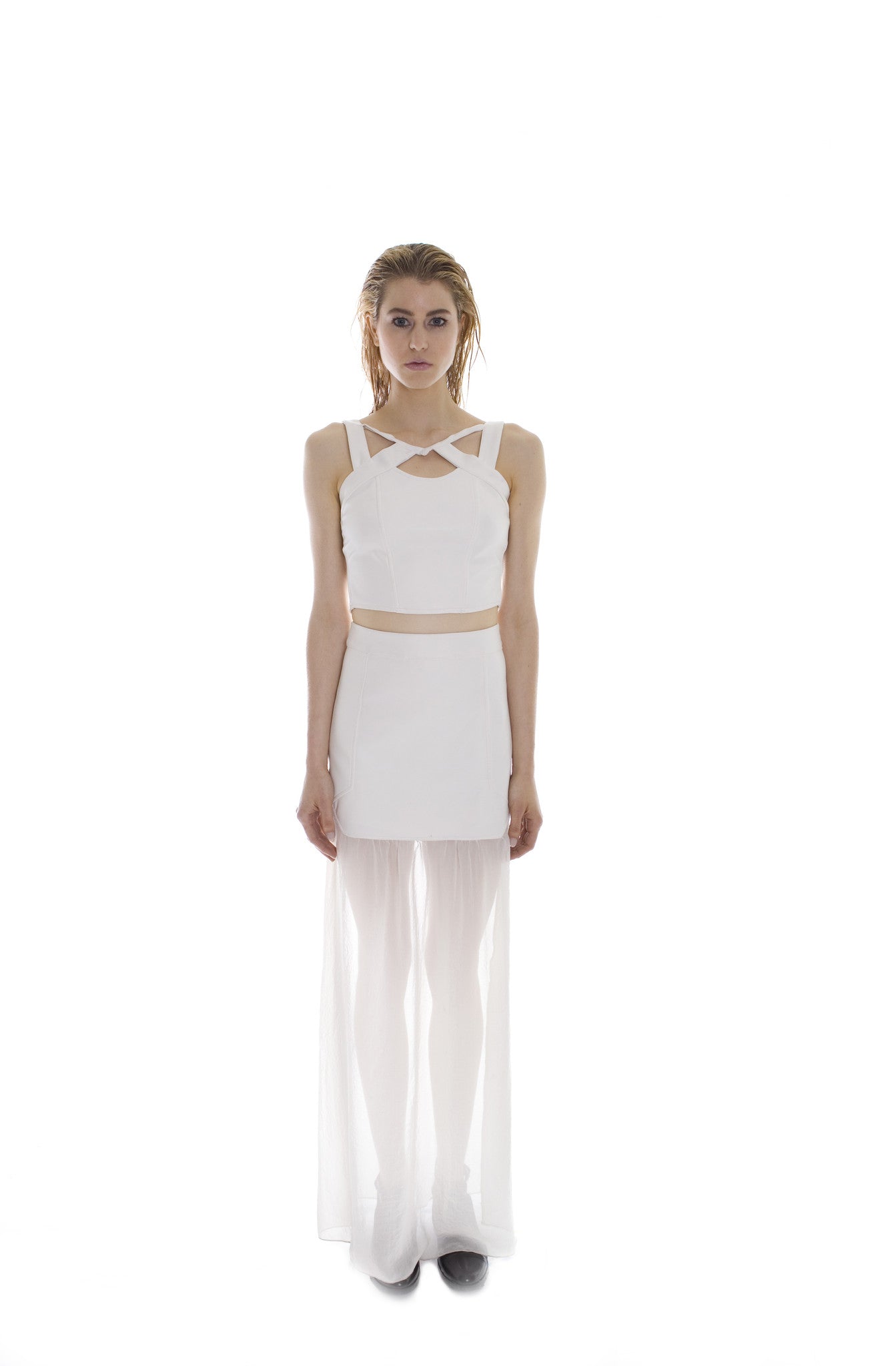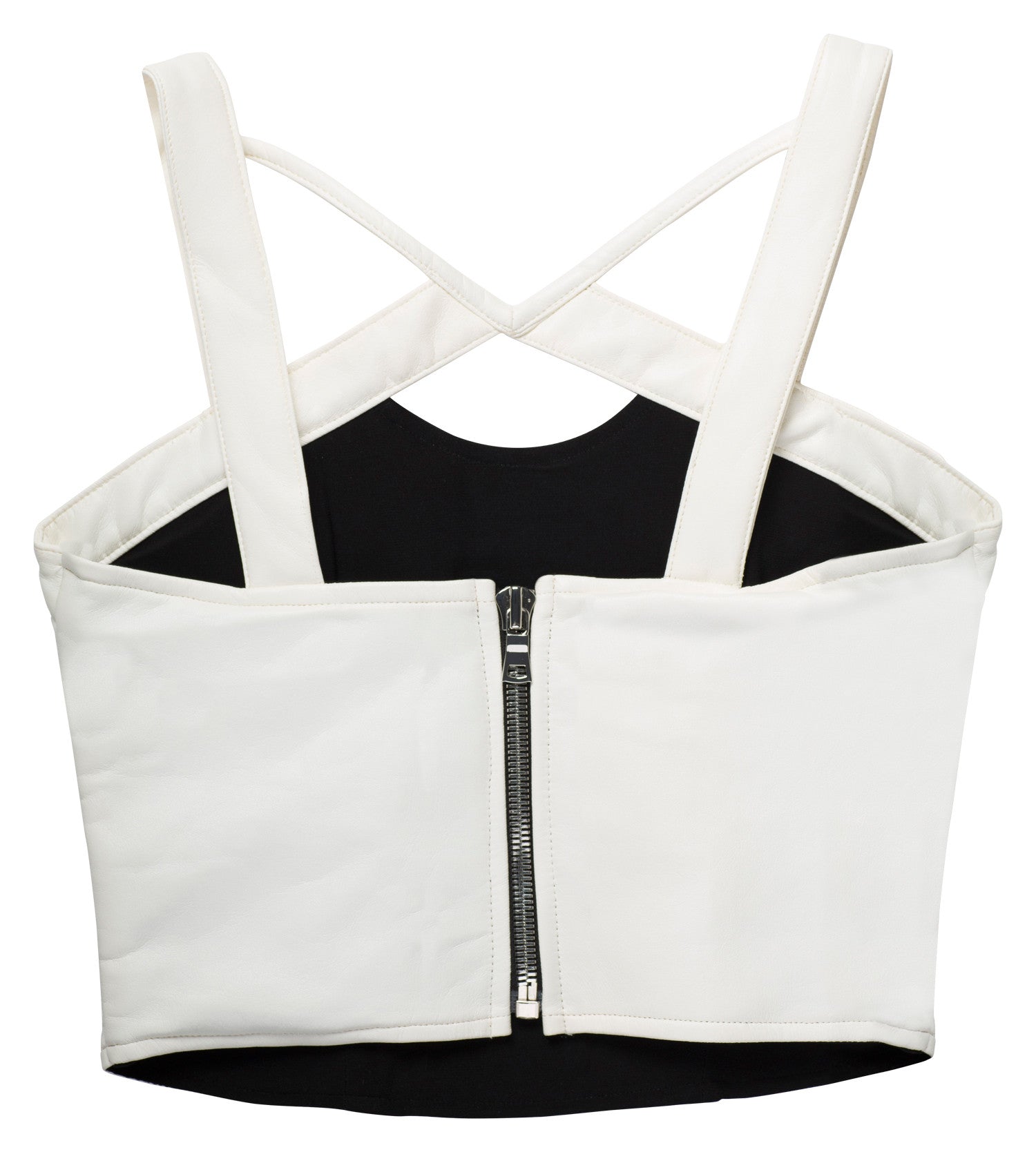 Super soft and luxurious Vegan leather bustier, fully lined. Cut-outs and criss cross detail at neck. Exposed silver oversized zipper back closure. Also features black piping detail. Pair with matching piping mini skirt or wear solo. This item runs true to size with a tight, form fitting fit. Item is shown worn with a high waisted skirt and may have an exposed midriff fit if worn with non-high waisted pieces.